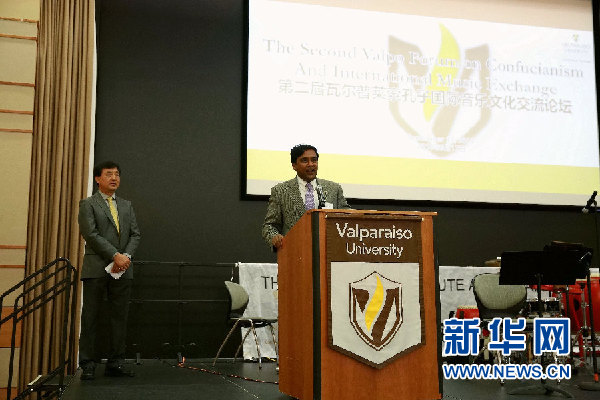 9月17日,美國瓦爾普萊索大學(xué)副校長賈伊尚卡爾·拉曼在第二屆孔子國際音樂文化交流論壇開幕式上致辭。新華社記者汪平 攝