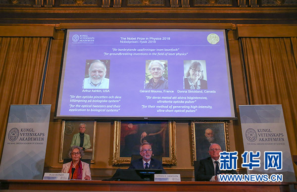 10月2日,瑞典皇家科學(xué)院在斯德哥爾摩舉行新聞發(fā)布會,公布2018年諾貝爾物理學(xué)獎獲得者。新華社記者 葉平凡 攝