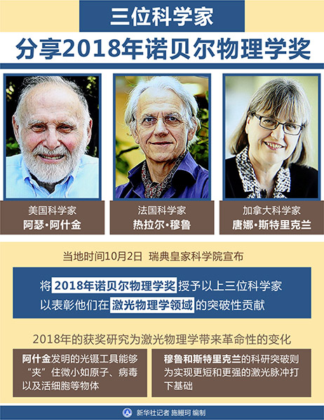 圖表:三位科學(xué)家分享2018年諾貝爾物理學(xué)獎 新華社記者 施鰻珂 編制