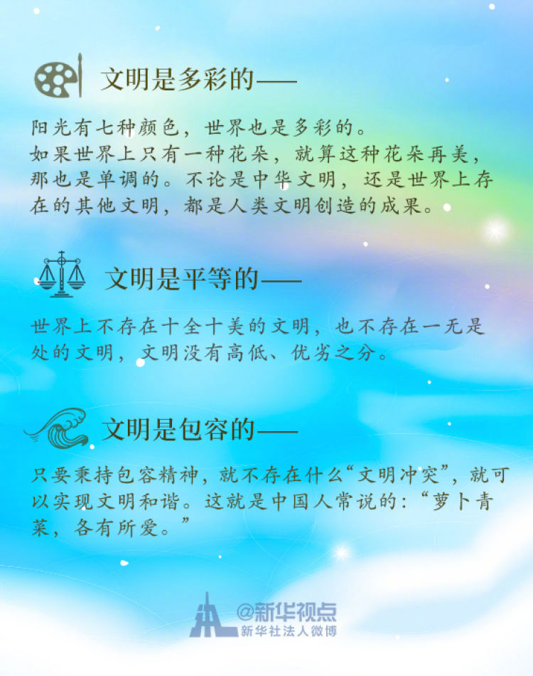 在這次演講中,習近平主席用生動的語言講明了對待不同文明應有的態(tài)度和原則: