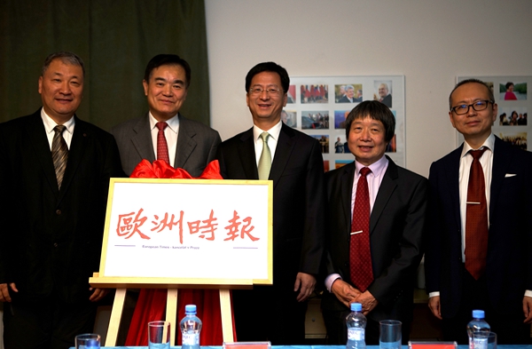 張曉貝(左二)張建敏(左三)共同為歐洲時報社捷克辦事處揭牌。達娜·科什奈洛娃 攝