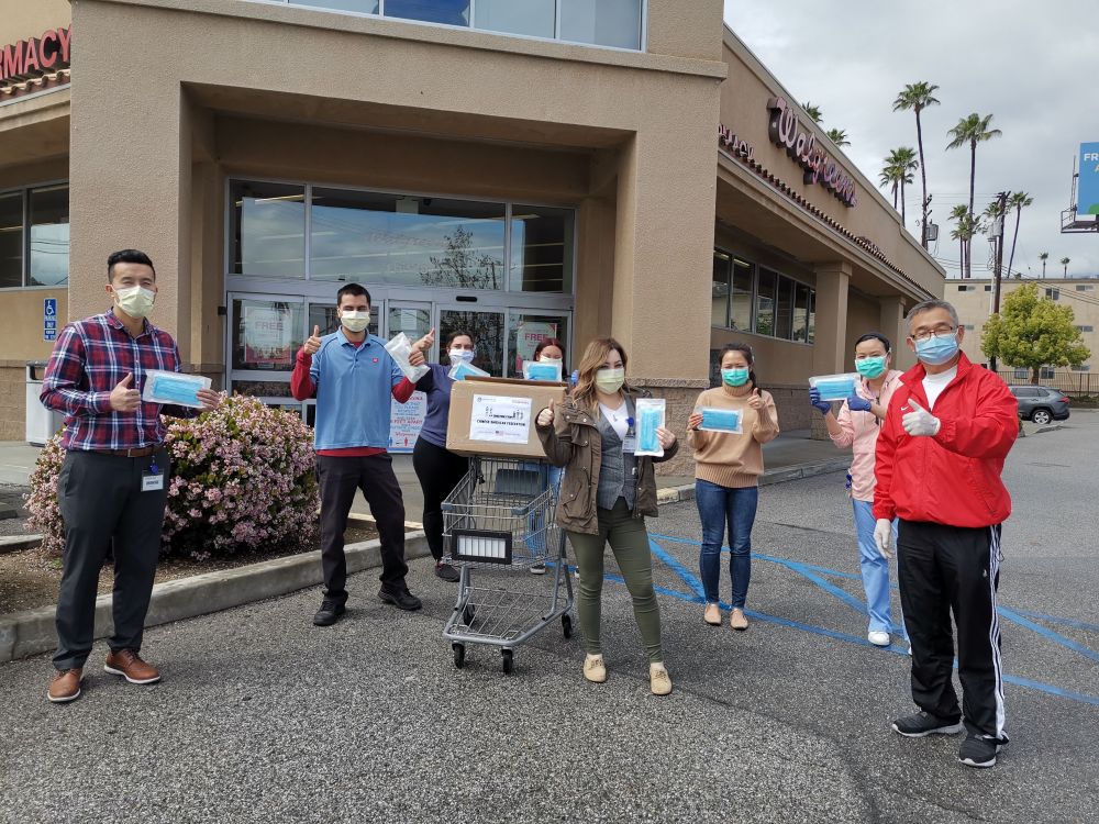 2020年4月7日,在美國洛杉磯縣天普市,美國南加州華人聯(lián)合總會代表向當(dāng)?shù)匾患宜幍昃栀浛谡謺r(shí)合影。(新華社發(fā))